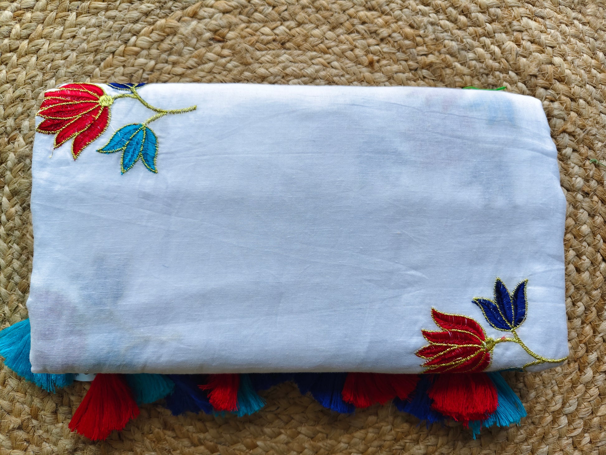 This white coloured saree with embroidery lotus design will give a very soft and sophisticated look! The multicoloured tassels add to the style!! It's a summer friendly saree and suited for Indian weather. Look gorgeous and be comfortable all day long with this saree!