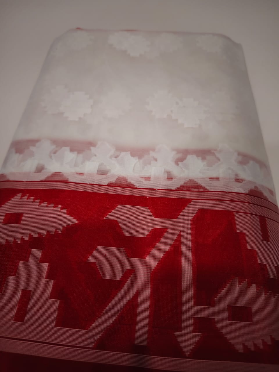 Celebrate the spirit of Durga Pujo in timeless elegance with this stunning white and red tissue Jamdani saree — a colour pairing deeply rooted in the festival’s tradition. Handwoven by master artisans, this saree is a true work of art, featuring intricate weaves crafted using the classic discontinuous weft technique.